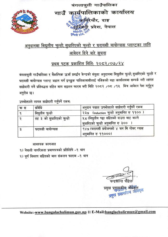 » अनुदानमा विद्युतीय चुल्हो र घरायसी बायोग्यास प्लाण्टका लागि आवेदन दिने सूचना।।