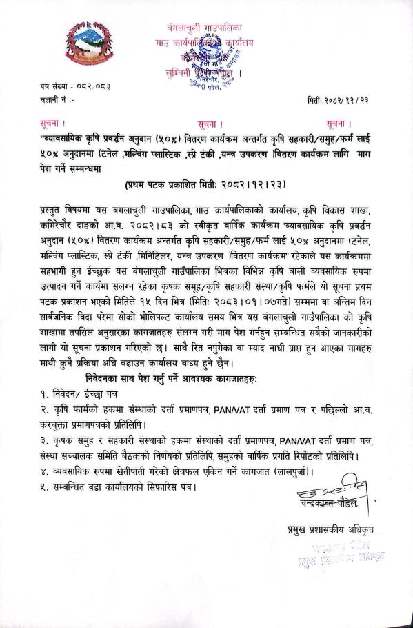 व्यावसायिक कृषि प्रवर्द्धन अनुदान (५०%) वितरण कार्यक्रम अन्तर्गत कृषि सहकारी/समूह/फर्मलाई ५०% अनुदानमा टनेल,मल्चिंग प्लाष्टिक,स्प्रे टंकी, यन्त्र उपकरण वितरणका लागि माग पेश गर्ने सम्बन्धी सूचना ।।।